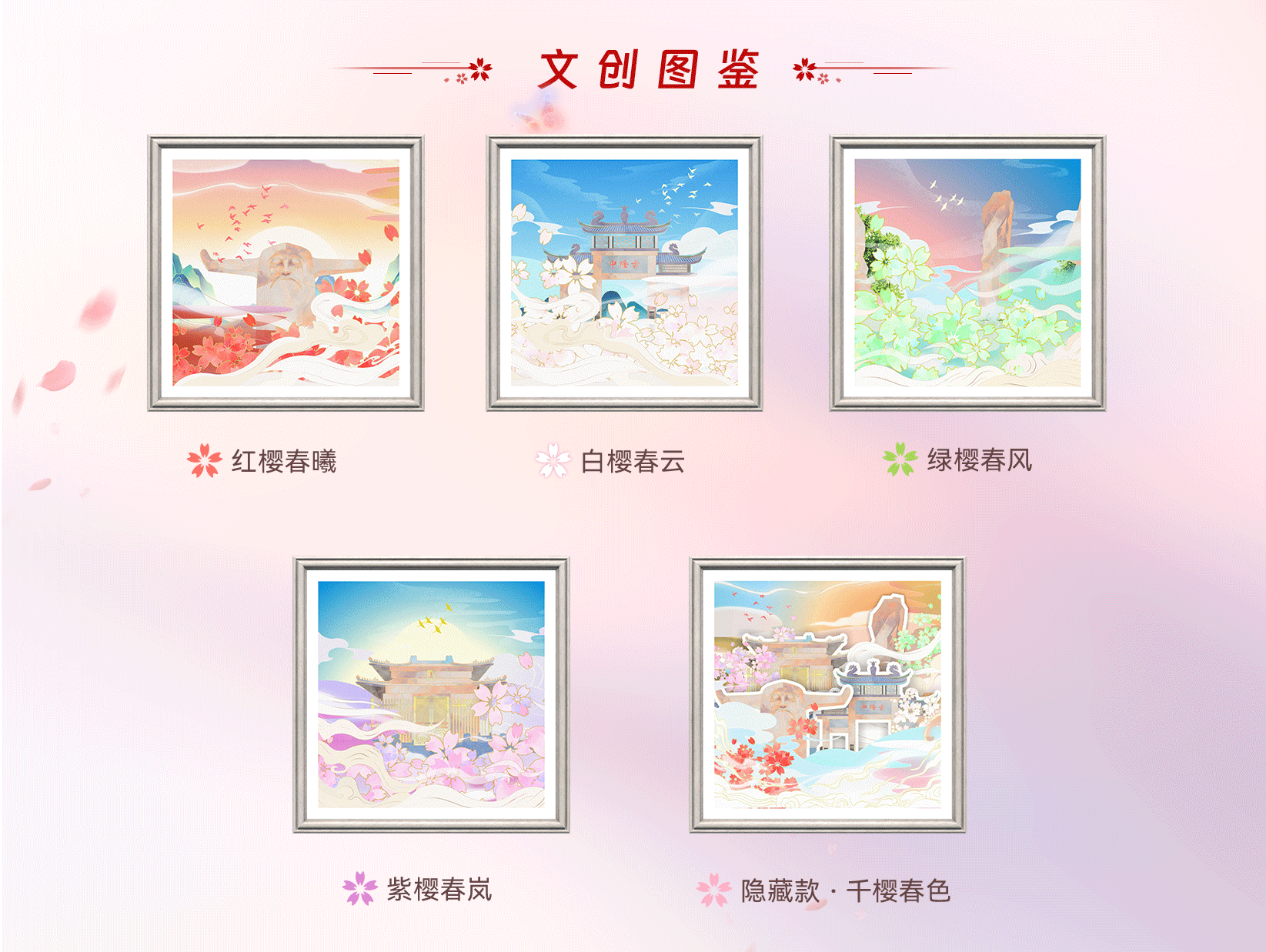 盲盒包含《紅櫻春曦》、《白櫻春云》、《綠櫻春風(fēng)》、《紫櫻春嵐》四款數(shù)字文創(chuàng),總計(jì)400000份。購齊此四款者有機(jī)會領(lǐng)取隱藏款《千櫻春色》(限量6000份),隱藏款特定編號的用戶可獲得景區(qū)門票權(quán)益大禮包。