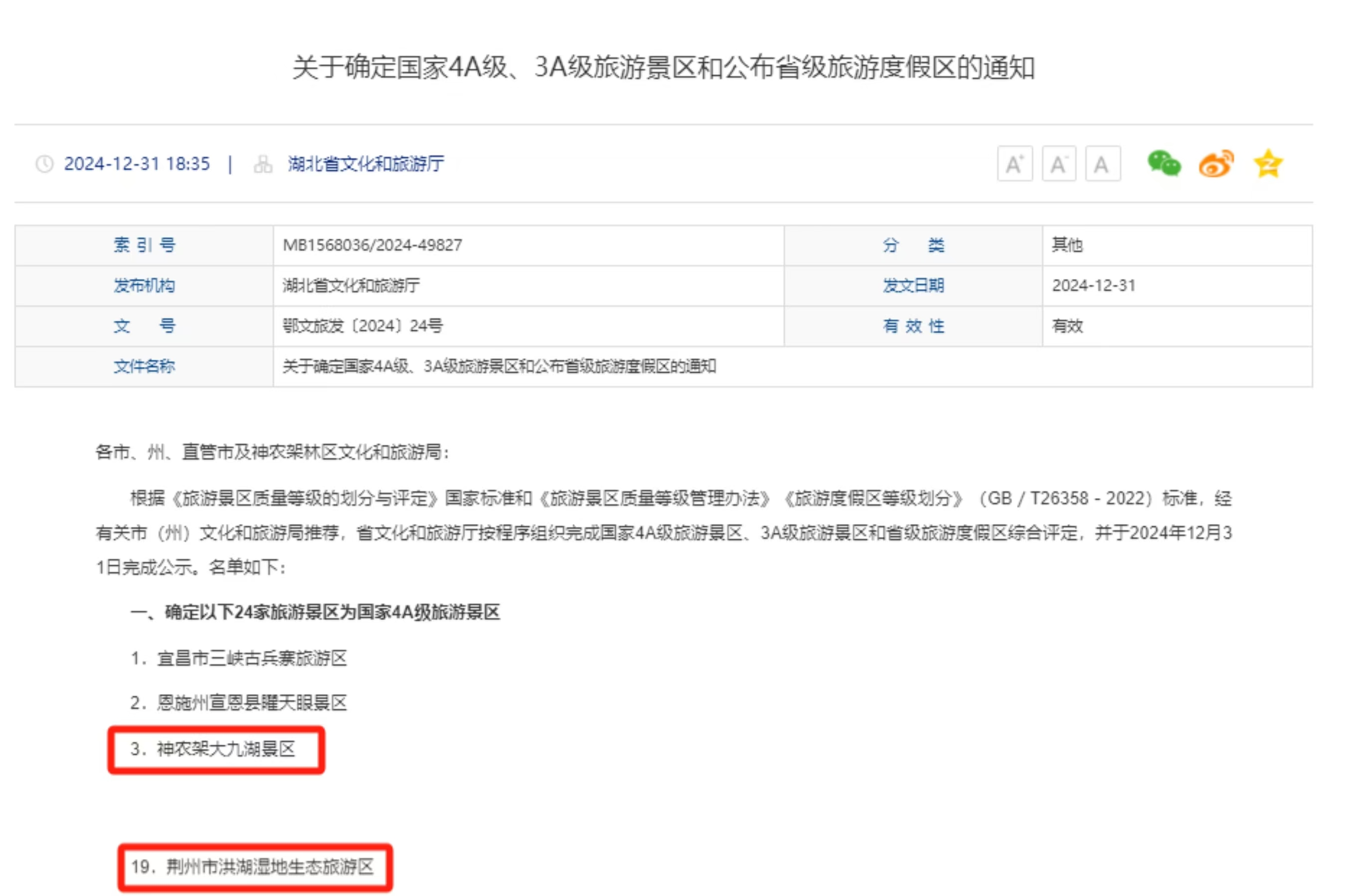 湖北文旅集團新增兩家國家4A級旅游景區(qū)。近日,湖北省文化和旅游廳發(fā)布公告,經(jīng)湖北省旅游景區(qū)質(zhì)量等級評定委員會組織評定,集團旗下神農(nóng)架大九湖景區(qū)、荊州市洪湖濕地生態(tài)旅游區(qū)獲評“國家4A級旅游景區(qū)”。圍繞4A創(chuàng)建,神農(nóng)架大九湖景區(qū)堅持生態(tài)科技賦能,堅持升級科普游覽,堅持優(yōu)化服務(wù)管理,塑造突出的生態(tài)旅游品牌形象。洪湖濕地生態(tài)旅游區(qū)對標國內(nèi)一流旅游景區(qū),從硬件提檔、軟件提質(zhì)、服務(wù)提升三方面著力,景區(qū)面貌煥然一新。