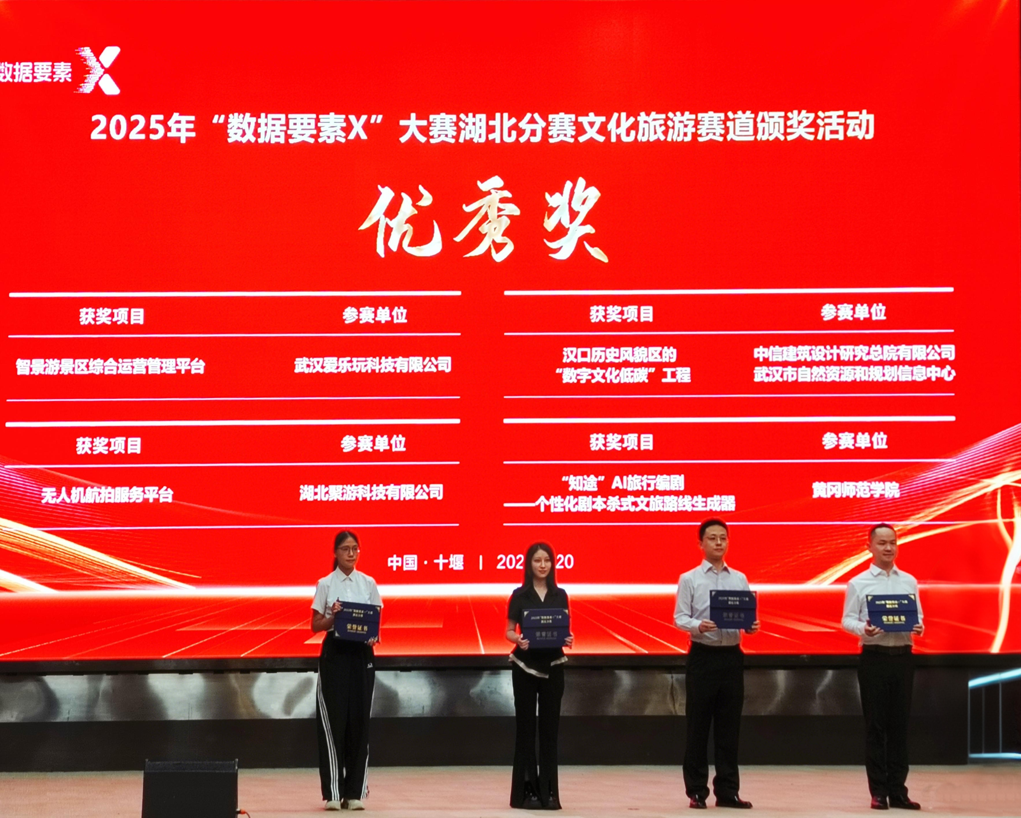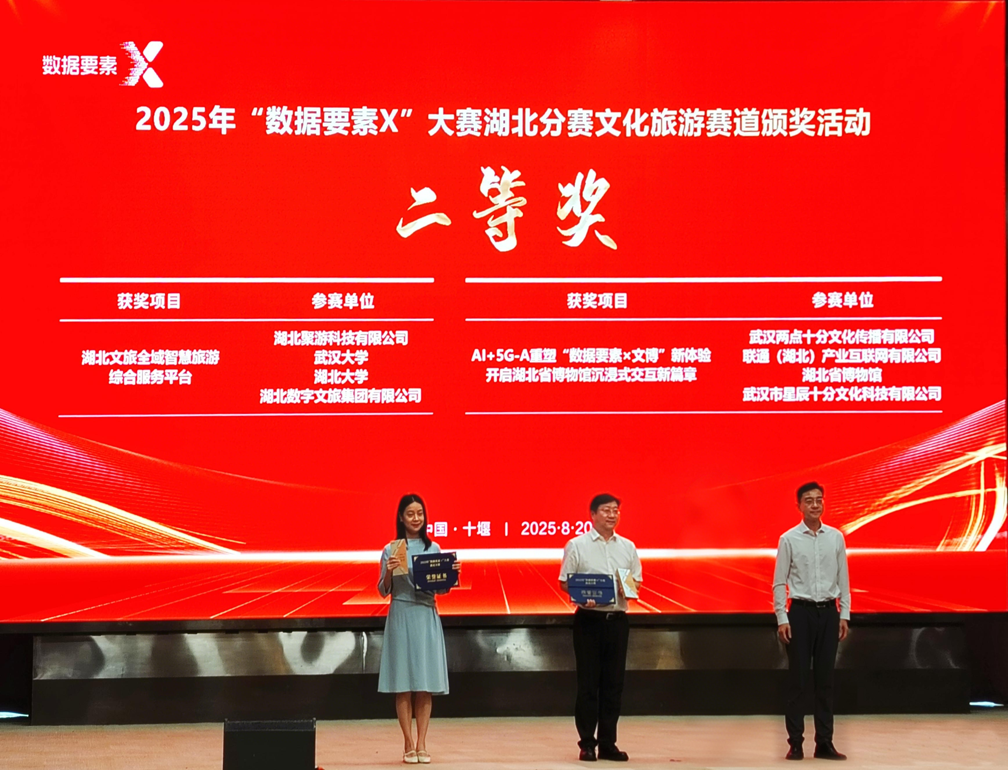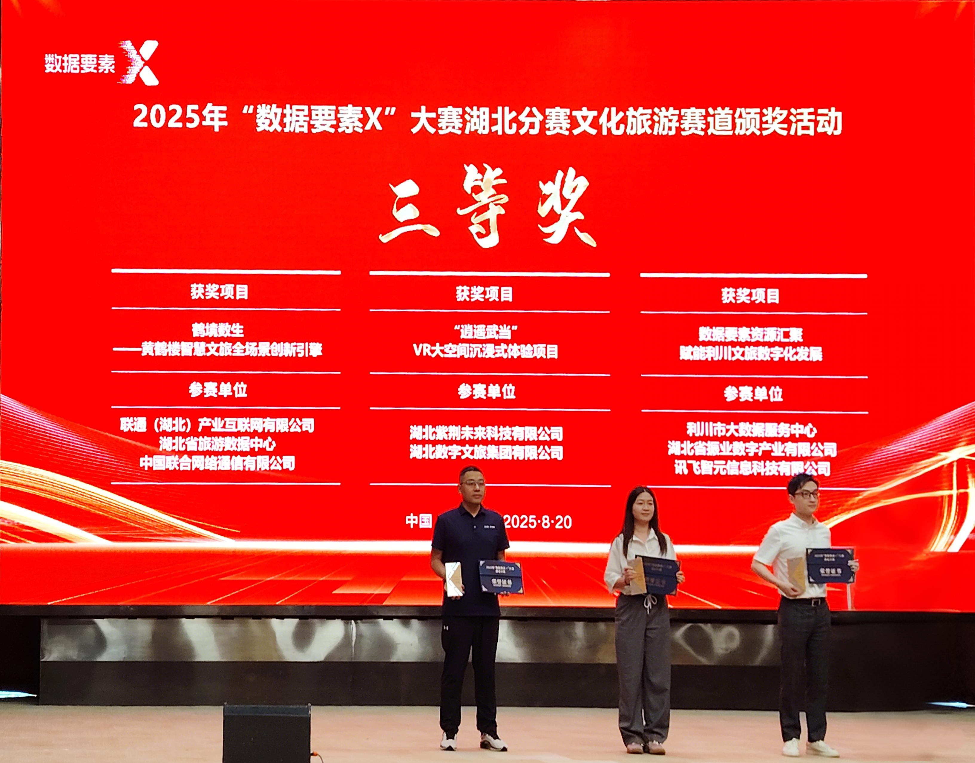 8月20日,由湖北省數(shù)據(jù)局、湖北省文化和旅游廳、十堰市人民政府主辦的2025年“數(shù)據(jù)要素×”大賽湖北分賽文化旅游賽道決賽活動(dòng)在十堰成功舉行。數(shù)旅集團(tuán)參賽項(xiàng)目均獲得獎(jiǎng)項(xiàng),湖北文旅全域智慧旅游綜合服務(wù)平臺(tái)獲二等獎(jiǎng)(賽道第2名)、“逍遙武當(dāng)”VR大空間沉浸式體驗(yàn)項(xiàng)目獲三等獎(jiǎng)(賽道第4名)、無(wú)人機(jī)航拍服務(wù)平臺(tái)和智景游景區(qū)綜合運(yùn)營(yíng)管理平臺(tái)獲優(yōu)秀獎(jiǎng)。在參賽數(shù)量、入圍率及獎(jiǎng)項(xiàng)層級(jí)上均實(shí)現(xiàn)顯著突破,充分彰顯了公司在數(shù)據(jù)要素領(lǐng)域的技術(shù)積累與創(chuàng)新實(shí)力。
