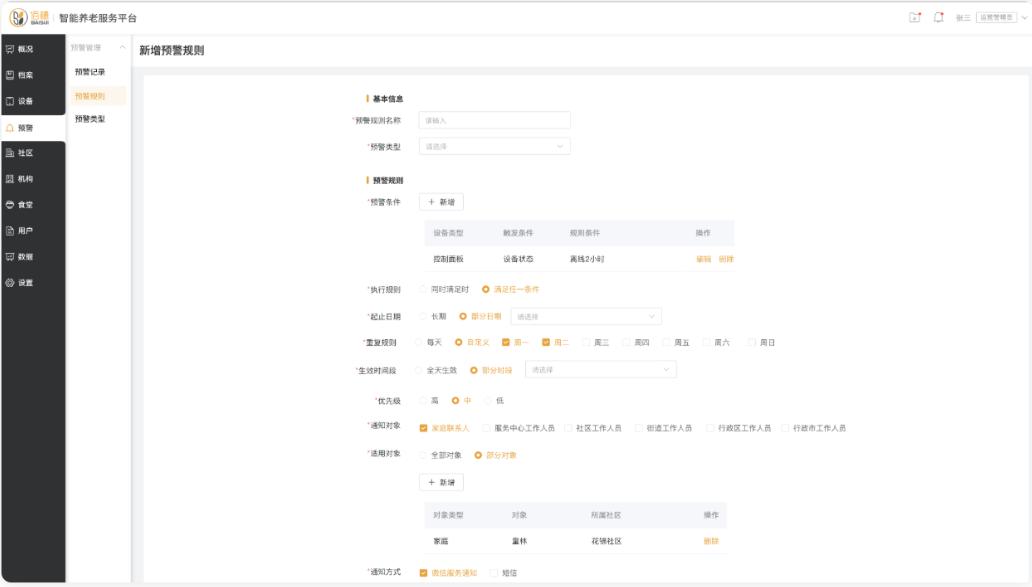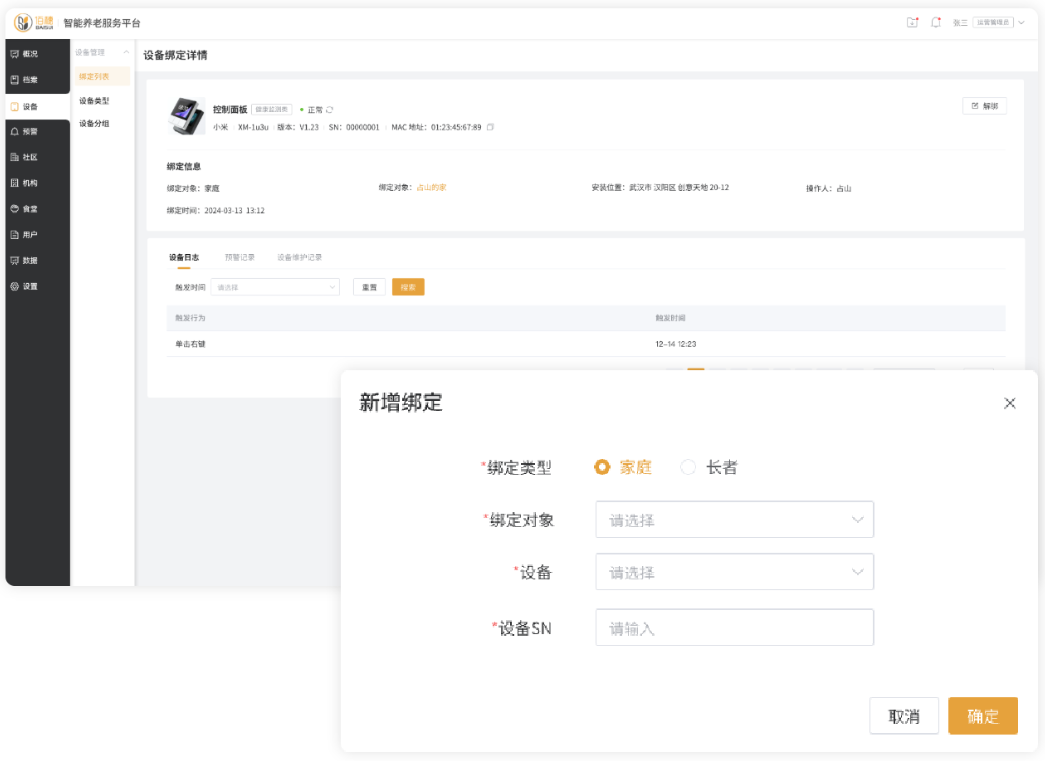 可實時采集設(shè)備連接狀態(tài)與運行狀態(tài)數(shù)據(jù)。無論是設(shè)備的在線/離線情況,還是運行中的各項參數(shù)指標(biāo),都能精準(zhǔn)掌握。以便及時發(fā)現(xiàn)設(shè)備異常,快速定位問題,確保智能設(shè)備始終處于良好工作狀態(tài),為養(yǎng)老服務(wù)提供可靠支撐。