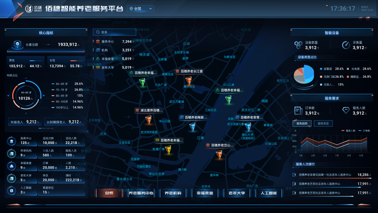 全面集成了長者、智能設(shè)備、服務(wù)需求等各類信息,不僅能展示長者總數(shù)、性別年齡分布、失能及認(rèn)知障礙等特殊老人數(shù)量,還涵蓋服務(wù)中心、機構(gòu)等養(yǎng)老設(shè)施相關(guān)數(shù)據(jù)。通過地圖標(biāo)記、餅圖、折線圖等可視化方式,將復(fù)雜數(shù)據(jù)直觀呈現(xiàn),同時精準(zhǔn)統(tǒng)計設(shè)備數(shù)量、采集量、訂單數(shù)等,支持按時間篩選。