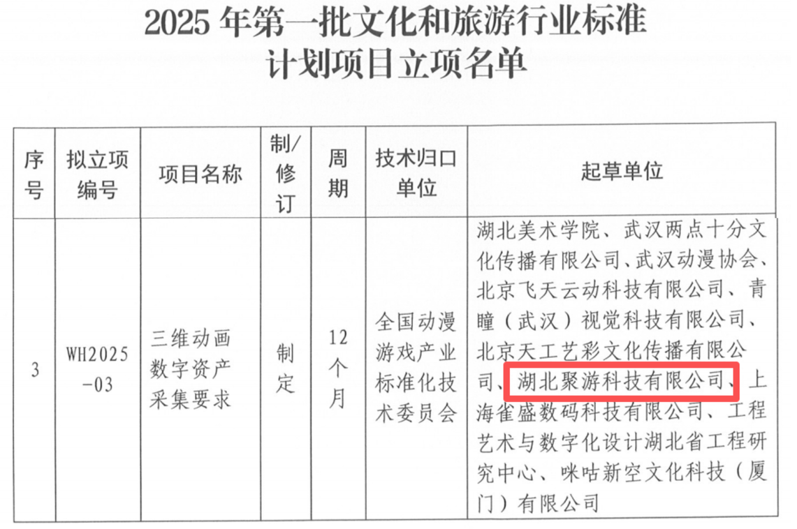 近日,文化和旅游部科技教育司發(fā)布了2025年第一批文化和旅游標(biāo)準(zhǔn)計(jì)劃項(xiàng)目立項(xiàng)名單。由數(shù)旅集團(tuán)旗下聚游科技參與制定的《三維動(dòng)畫數(shù)字資產(chǎn)采集要求》成功入選,實(shí)現(xiàn)了在文旅行業(yè)標(biāo)準(zhǔn)化領(lǐng)域的重大突破。